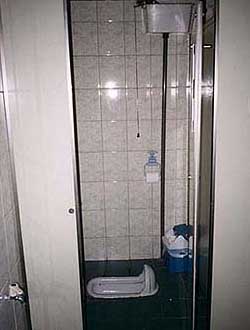 First, the good news. This toilet (yes, that's what it is) is a dying breed in Korea. New Korean public buildings and apartments almost always have western sit-upon toilets these days. But the chances are that at some point in your Korean year or two, you're going to have to use one of these "squatter closets." Older public buildings still have them (and your hagwon might, as Margaret's did). Railway and bus stations usually have both Asian and western toilets, but some older ones have only the squatters. Asians consider squatters more sanitary because your bum doesn't touch anything. (Obviously not. It's hanging out there in the middle of the air.) There's also a reason that your dog or cat instinctively squats when he poops -- it aligns your plumbing right to get the nasty stuff out. Besides, Korea is the land of ppalli, ppalli (hurry, hurry). Squatters encourage speed and efficiency. You don't take a magazine into the loo when it's fitted with one of these gadgets. So, on the assumption that you'll probably run into a few of these while you're in Korea, here are some tips. Using a squatter closet: If you carry your wallet in your back pocket, transfer it to a side pocket before dropping your pants. The consequences otherwise are unthinkable. Stuff with straps, such as camera cases and shoulder bags, you can hang from your neck if there's no hook in the stall, which is fairly likely. Roll up your pants cuffs. You also won't be dropping your pants all the way. Put 'em down around your ankles, and not only will they get dunked in anything on the floor (ick), they may also, uh, get in the line of fire if you're not careful (also ick). The part that rises from the floor is the front (call it the hood). This makes sense if you think of a little boy's potty. Face the hood and stand over the rest of the squatter, with your feet on either side of it, beside or just behind the hood. Drop trou to half-mast, and tuck the waistband under your knees as you squat down.No job is finished until the paperwork is done. And here is where I might lose you. So take a deep breath, because you'll need it, quite literally. Don't drop your used TP in the toilet yet. Look round the stall. See that metal or plastic trash can with the pop-up or lift-up lid? Yeah, that one within easy reach. Guess what it's for: not just for paper towels. That's not even just for used tampons and pads. It's also where your used TP goes. Yeah, I know, ewwww. Fact: Squatter closets were not designed to flush TP. Some older throne toilets can't, either, and older buildings themselves often don't have the greatest plumbing. If you see a can in the stall but decide to chuck your TP in the toilet anyway, you're apt to plug up the plumbing. That'll upset the building maintenance people. They will then think glowering thoughts about westerners. You don't want that to happen, do you? I didn't think so. Do your duty. Hold breath. Pop top. Drop. You'll have a year. Get used to it. For more suggestions and background on squatter closets, see this page on their nearly identical Japanese cousins. There's also a link on that page to step-by-step illustrated instructions which are much more entertaining than mine.Now, some general notes on Korean restrooms. Privacy: There was a time when Korea was infamous for some of Asia's filthiest public restrooms. Say what you will about Korea, they usually react to this kind of negative publicity -- and sometimes in ways that actually help! They also tend to go a little overboard. These days, it's not all that rare to find vases of flowers in public loos, and cleaning ajomma now are a lot more common. Sometimes they'll clean several times a day, not just after hours. What are ajomma? Middle aged women. In the mens' room? Yep. Easy there! Did I not say middle aged women? They're there to do a job. Unlike their prudish American counterparts, they're not going to demurely excuse themselves. Ignore them. Trust me, they'll ignore you too. You're in Korea. Privacy is different here. Get used to it.TP: for all the improvements, public restrooms still may or may not supply certain basics that we Americans sort of take for granted -- toilet paper, for example. The ones that do may have a dispenser outside the toilet stalls, but none inside. Check before you get settled in a stall and grab some from the dispenser if need be. If you forget, and there's none in the stall, I hope you have a pack of tissues in your pocket. Don't forget to use the pop-top can. Back when Margaret was teaching in 2000 and 2001 -- and you may yet find some of this today -- small family-run restaurants often didn't buy paper napkins for the tables. They just put a TP roll on each table. Many times there'd be a more discreet napkin-stand-in TP roll next to the water cooler or aircon, too. If you were headed for the loo, you'd grab some, since you'd never know what the restroom had. Our Western dining companions found this amusing. Our Korean friends didn't even notice. For better and/or worse, today most Korean eateries have small, neatly folded paper napkins on the table instead. Our lifeline is gone! I hope you have a pack of tissues in your pocket. When we were there, the Kangnung (Gangneung) gas stations gave away free tissue packs with each purchase. Our Korean friends translated this bonus into English as "service." Nice thought, but it did us no good, since we never had a car or scooter and never bought gasoline. I also recommend a little bottle of hand sanitizer. Quite a few Korea restrooms don't provide towels. Some don't have soap, either. If they do, it may be a communal bar on a curved rod above the sink. (Fear not. This is no more unsanitary than a US-type push-button or pull-lever soap dispenser.) A few, mostly in the boonies, don't even have sinks. Does all this leave you unsettled, you poor germ obsessed, antibacterially sanitized American? It shouldn't. Remember that even though they have a much higher smoking rate, Korea's li