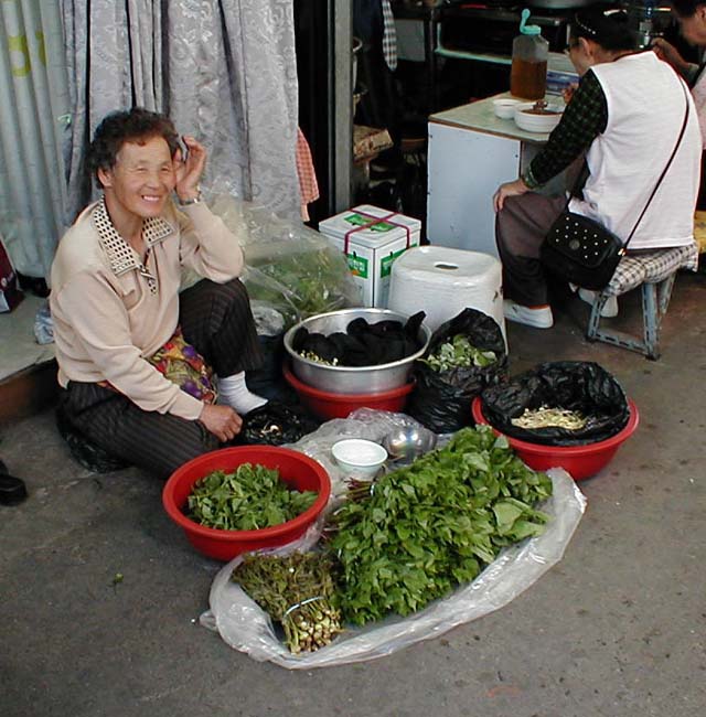 In the photo above, a vegetable vendor in Kangnung's central market awaits a sale. Moments after