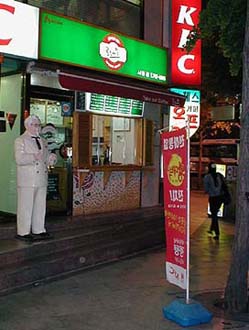 but most of the items on the menu will be pretty close to what you're used to, if not identical. We spotted this KFC in Seoul in 2000, with the Colonel inviting those benighted health-conscious Koreans to come in and chow down his high-fat, high-calorie, high-sodium goodies. They did, and do. By 2010, the franchises had established beachheads in the smaller cities, too. Surprisingly, McDonalds didn't roll into Kangnung (Gangneung) until our 2004 visit, but now every time we go, they have more junk food emporia. There are also some home-grown options - PFC, for example, whose logo looks suspiciously like KFCs. They serve respectable greasebucket fried chicken. On the side: not coleslaw, but little disposable plastic tubs of kimchi.