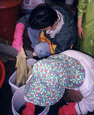 Damwon. Everyone just called her Sensayng-nim, or teacher. That's standard in Korea, by the way -- to use someone's title rather than his or her name. It's a sign of respect. At the institute and here at home, I'm just called "teacher" most of the time. It gets confusing at the institute because there are several teachers there, and when a student says "sensayng-nim," I'm not sure whether he or she means me. The dyebaths were made up in advance, and there were 4 colors to choose from: bright yellow, sage green, brown, and sort of a mauve-purple. I liked the green color a lot, but so many people wanted that color that teacher looked a little worried, so I went for the purple. I wrote down the Korean names of the dyeplants, but wasn't able to find translations for them in the dictionary. The purple and yellow were wood, the brown was leaves, and I'm not sure about the green.