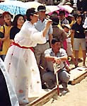 There was an older gentleman in a blue hanbok (the Confucian costumes were black) directing them when to go to the altar, when to bow, when to get up from the bow, and putting their hats and belts back on when they fell off. I felt like I was watching a Lions Club or something that had volunteered to fill in for the day. According to the Tano Festival literature, this was Kim Chin-Dok, "important government-designated intangible cultural asset no. 13 who is an expert in ceremonial formalities." It's interesting to see the differences between the way our government and the Korean government handle religion. In Korea, instead of being completely isolated from religion, they seem to try to support all the religions equally. The audience was packed in around the performance area, sitting on the floor. Those who were trying to be proper had a piece of newspaper or cardboard to sit on, and those who didn't care or were just tired of standing (like me) were just sitting on the bare floor. I stood in the back for about 45 minutes, and just didn't want to stand anymore, so when a spot cleared out and no one else claimed it, I did. It's funny that people don't quickly claim a spot that clears out unless you count the fact that whoever is behind that spot spreads out her legs (the crowd was almost entirely old women) into it. But if they want to sit down, they just plow through the crowd and force a place for themselves. Anyhow, picking their way through this crowded floor were half a dozen or so people selling ice cream, yogurt (liquid yogurt to drink -- I haven't seen it at home, but it's pretty good), candy, snacks, and of all things safety pins and strips of rubber (like cut rubber bands, only about 6 feet long -- I haven't figured out yet what they do with them). Towards the end of the Confucian ritual people started filing in to bow at the altar and do the paper-burning thing. You make a monetary offering and a priestess lights a piece of paper in the candle, burns it almost all the way, and lets go. If the ash rises well it means your prayer is favorably answered. This continued throughout the Shaman ritual and as far as I could tell for the rest of the day. That mountain god has his work cut out for him. After the Confucian ritual was over they took off all their Confucian outerwear right there on stage as it were, and took down all the sacrificed food and handed it out on plates to the crowd, except for some sort of white stuff in a bowl (rice something I expect, but not plain rice). That was just taken out of the bowl in great handful chunks and handed to people, who broke off smaller chunks and handed them around. It was soft enough to come apart easily and firm enough to keep its shape, even when one of the guys started tossing it over the crowd to the people in the back. I didn't get to experience it personally, which is a shame, because I'm very curious about it. It was very popular -- everybody wanted some. The men were very funny out of their black clothes. They had hanbok on underneath of course, but it was hot, so they were very light hanbok, quite transparent. So one guy's cigarette packs were clearly visible through his pocket, another's chest was visible, and another one had on blue underpants which showed clearly through his white hanbok. This made them look even more like guys from the Lions Club. While some were handing out food, others were packing up, and they made a huge tower of wooden boxes, copper kettles and lacquer tables which they then proceeded to tie together with a very long cloth. It was perhaps 7 feet tall. I thought this was for carrying purposes, and eventually they did get it tied securely enough to pick it up and move it. But they only moved it to center stage, and then put a red and gold coat and hat on it. Maybe the clothes were supposed to be the village chief for the satirical play, Wonnimnori, which is part of the Shamanist service.