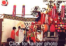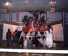 trip with "free talk" (English practice). Tano is rather different late at night. It's much more crowded, and if possible there are even more vendors out. I don't know about my two students, but I spent more time trying to keep them in sight than looking at Tano. We did have a good time, though. We got to see several drum performances. This was another competition, between schools. There was an elementary school group which was surprisingly good, and we got to see Mary's students perform. I should mention that my two students are Mary and Carol. Mary teaches English at one of the high schools in town, and Carol teaches English at one of the middle schools. Mary's high school team was really impressive in their playing. She said they won the competition last year, and I expect they won it this year too. We also saw a puppet show. It was very well done, again by students, and using huge numbers of puppets with only about half a dozen performers. It was a story about the overthrow of a bad king.