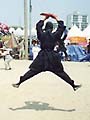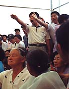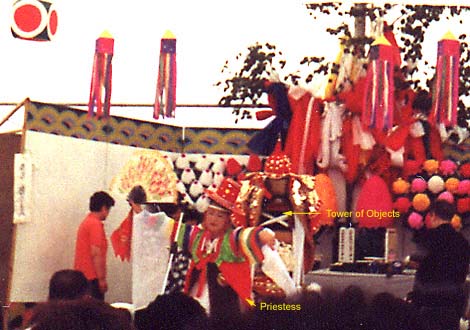 I felt sorry for the main priestess. That mountain god is working her altogether too hard; she had practically no voice left. There were 3 priestesses that sang, and others that burned papers, but one was obviously no. 1. So she started off the ritual singing and dancing to the tower of objects, and very picturesque she was, too. She'd just gotten started when some guy in the back corner started pointing his finger at her and screaming at her. He was soon joined by a few others. At first I wasn't sure if he was just going into some pagan throes or what, but then I decided that he was a Christian looney tunes protester. It's a shame that it's so often the intolerant versions of Christianity that do the missionarying, because that just sets up situations like this. It really gives Christianity a bad name. The poor priestess tried to ignore him and carry on, but he kept screaming at her and pointing his finger at her, and eventually she started screaming back. Then he started coming towards her through the crowd, and some guy tried to shove him back, and they got into a fight right where I was sitting. I tried to get a picture, but they were too close to get a good one, so I decided discretion was the better part of valor and moved out of the way. A lot of people vacated at that time, and I was able to get a much better seat. Anyhow, the authorities managed to eject the main protester, and the priestess carried on with the program. She went back to singing and dancing to the tower of objects, and eventually started twitching and taking off her top layer of clothes. I suspect this is when she was possessed by the mountain god -- at least that's what's supposed to happen. And then she leaned towards the tower of objects and bit it, and lifted the whole tower with her teeth. And it can't have been light. The other priestesses untied the tower and started removing parts, and that finally left her with a large kettle that she was holding by the handle (a side handle) with her teeth. This was apparently the signal for the other priestesses to take kettles too, only in their hands, and join the snack vendors in making their way through the crowd taking a collection. I threw in a couple thousand won (about US$1.80) -- they sure had earned it. Then they went back on "stage" and took turns singing after wresting the kettle from the one priestess's mouth. I watched for a while longer and then wandered off.