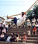 The first group was very young. The second group was much older, with the exception of one girl who looked to be perhaps 9 or so. I guess she was there with her grandmother or something. I was proud of her. She danced through that whole interminably long dance in all that heat right in the sun without giving out. I was pretty impressed with the other dancers, too, for that matter. They looked like they were between 70 and 90, and I can't imagine many Americans of that age holding up to that. Maybe that ginseng does something after all. Admittedly there wasn't a lot of vigorous head twirling with the streamers, but one guy had enough energy to throw in leaps and jumps all the way to the end. I was sitting next to a very nice old lady. She saw me sitting on the ground (as many of us were, including her and many other old ladies), and opened up her newspaper so I could sit on it with her, which also allowed me to share her umbrella. They use their umbrellas to keep off sun as well as rain, which saves having to keep a separate parasol. I've considered using mine that way too, but it's just one more thing to carry and juggle around every time I want to take a picture, so I'm going with a hat when necessary (which it is at Tano). Anyway she was very sweet to share space with me, and when her friend brought her frozen fruit juice she shared that with me too. I wished I had some way to return her kindness, but couldn't think of anything. But it was during the second incredibly long dance that my body started objecting, and we were sitting so close together (not full newspaper size -- think "small tabloid") that I couldn't squirm properly. When the dance finally ended, I thanked her profusely and wandered off. So you can see why I bought the little folding stool when I saw it (remember back that far?).