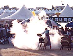 than the other, and literally picked him up before tossing him down. There were kids on Korean swings (Kune), which are similar to ours only you swing standing up. There was a Chinese Chess contest. There was a guy selling cow horns glued together with a wooden ring through them and a cloth strip with writing on it around the ring. I asked him what they were, hoping he would pick one up and show me what you do with it, but he just told me, so I have no idea. I considered buying one so I could show it to my students and ask them (I thought it would be a neat curiosity to have too), but they were 25,000 won (about US$23), which is a lot to spend on a curiosity.